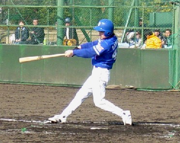 | 6回に鋭いセンター前ヒットを放ち、1点をもぎ取った桜井選手。 |